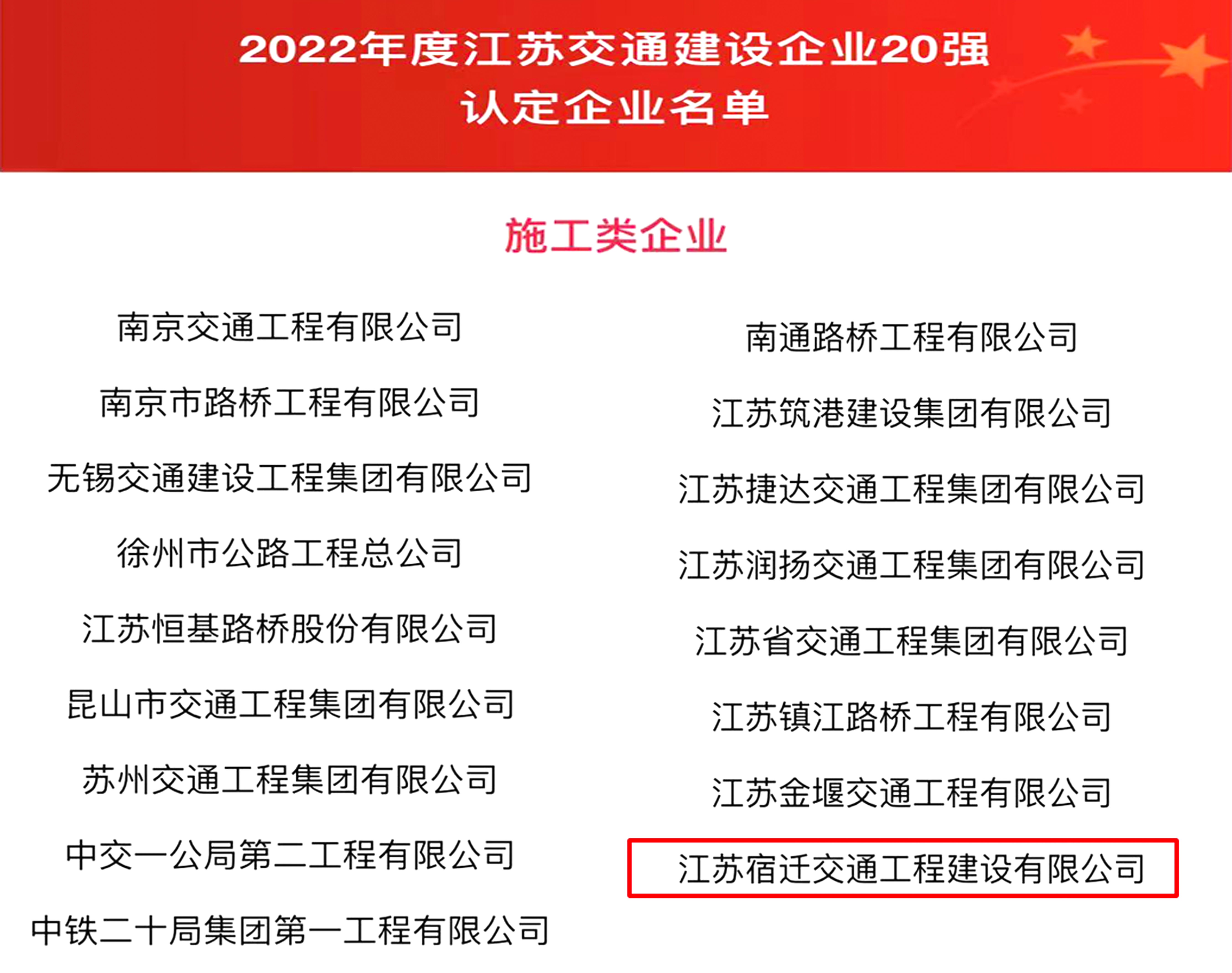 榜上有名!宿迁交建入选江苏交通“建设企业20强”