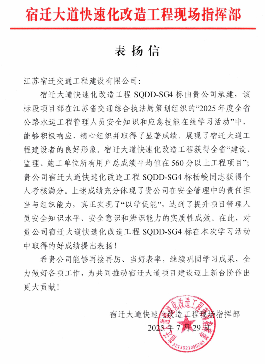 表扬信指出,在江苏省交通综合执法局组织的“2025年度全省公路水运工程管理人员安全知识和应急技能在线学习活动”中,SQDD-SG4标项目部积极响应、精心组织,不仅助力宿迁大道快速化改造工程跻身全省“建设、监理、施工单位所有用户总成绩平均值560分以上工程项目”行列,项目部员工杨峻更取得个人考核满分的佳绩。